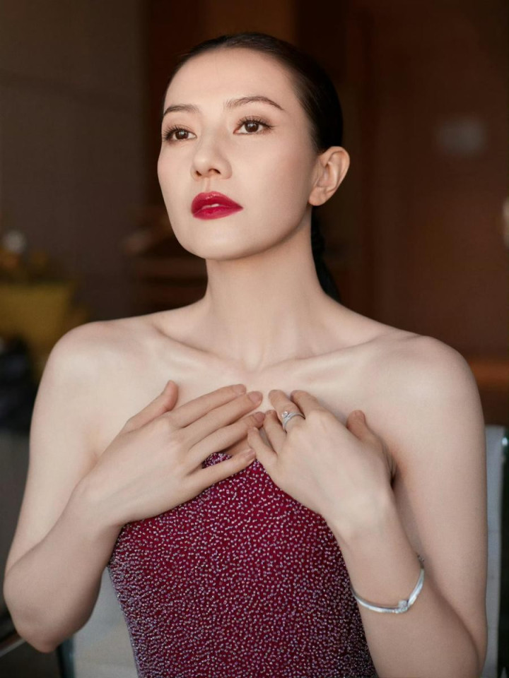 如果说金色亮片裙是气场全开的女王,那这套酒红色抹胸紧身裙就是温柔妩媚的女神,将高圆圆的温婉气质展现得淋漓尽致。酒红色本身就是极具氛围感的颜色,浓郁又高级,不挑肤色,还能衬得皮肤白皙透亮,自带一种复古又温柔的韵味。抹胸的设计大胆又精致,完美露出肩颈和锁骨线条,将上半身的优势展现得恰到好处,抹胸边缘的细腻剪裁,贴合身形却不紧绷,避免了走光的尴尬,同时也修饰了胸部线条。