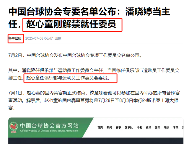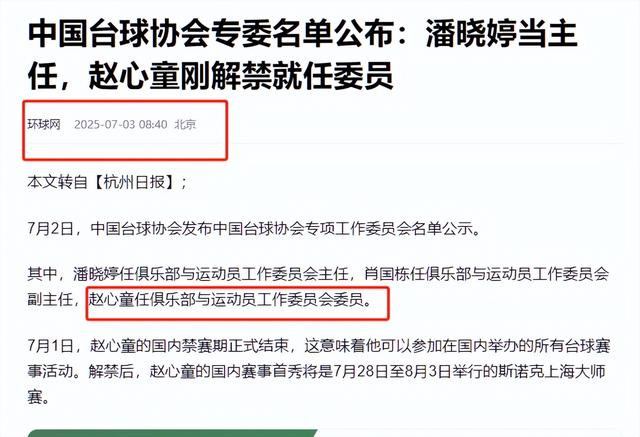 7月2日,中国台球协会官方宣布的专项工作委员会名单中,赫然出现了赵心童的名字。