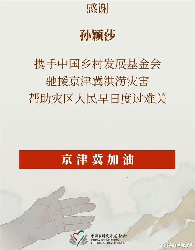 这期间,孙颖莎虽然表现不佳,在WTT美国大满贯早早出局,回到乒超也没有恢复正常状态,但她却心系河北老家的情况。众所周知,在“七下八上”这个特殊的汛期,国人本该在周末去“那么近,那么美”的河北旅游,但一场突发的强降雨导致京津冀地区部分乡村发生严重汛情灾情。而根据中国乡村发展基金会消息透露,孙颖莎驰援京津冀洪涝灾区!