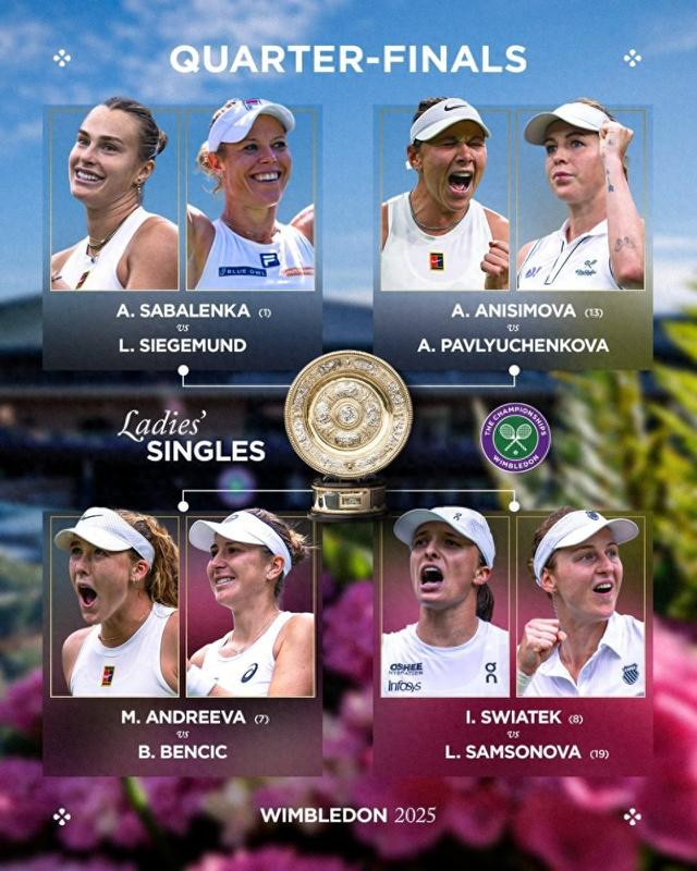 四强对决已经出炉:萨巴伦卡将迎战西格蒙德,阿尼西莫娃对阵帕芙柳琴科娃,安德列娃与本西奇展开较量,斯瓦泰克与萨姆索诺娃争夺半决赛席位。
