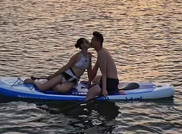 俩人在海边划桨板享受浪漫时光,看起来幸福满满,海面与落日余晖交融,画面十分唯美浪漫。