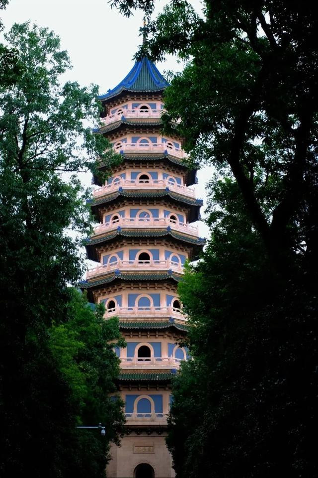 灵谷塔建于1931-1933年,由美国建筑师茂菲与中国建筑师董大酉共同设计。塔高60米,九层八面,用钢筋水泥和苏州花岗石混合构筑,坚固而雄伟。每层都以绿色琉璃瓦作披檐,塔内螺旋扶梯252级直通顶层,凭栏远眺,钟山风光尽收眼底。