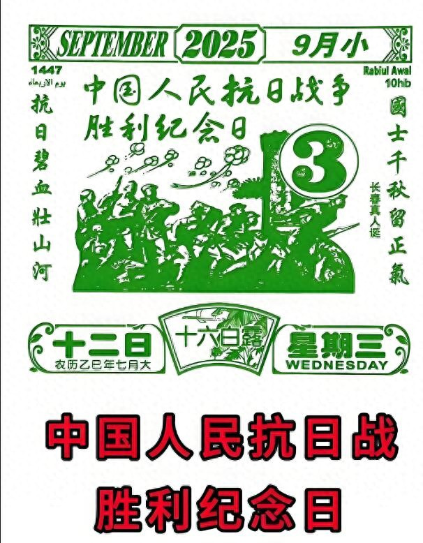 黄历心中过,遇事不出错。9月3日,星期三,农历七月十二,中国人民抗日战争胜利纪念日,勿忘国耻,振兴中华,在铭记历史、缅怀心烈的庄重氛围中,可安稳规划日常事物。大家可以先留下一句:光芒万丈。祝福祖国繁荣昌盛。这天值神勾陈,主意外阻碍,口舌争斗、阻滞拖延、日常沟通误会等需避免涉及法律、合约、利益争执类事务也不宜强行推进,这天是个平日,有平稳平淡之意,适合维持现状,稳步推进日常事务,不适合追求突破性进展。穿衣颜色推荐绿色、青色、翠色、浅绿系。不推荐白色、粉色、橙色、紫色系。打麻将求职找工作的可以去东北边,约会谈恋爱的可以约在家西北边。生肖注意事项,小鼠轻松顺利,小牛运气不佳,小虎身心舒畅,小兔精力充足,小龙充满干劲,小蛇压力增大,小马运势下滑,小羊思维活跃,小猴财运低迷,小鸡大吉大利,小狗口碑大增,小猪反应迟钝。祝你开心,福生无量。