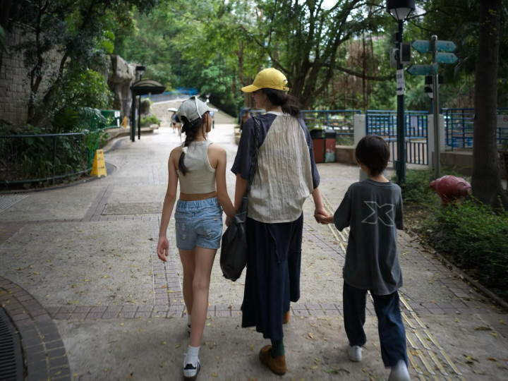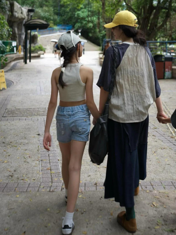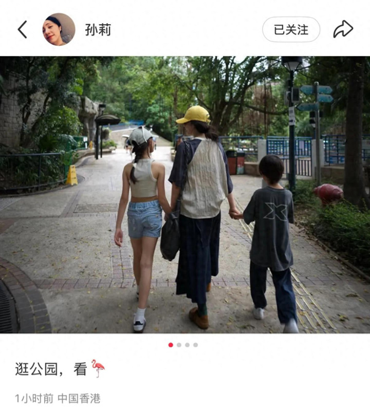 9月4日,孙莉在社交平台晒出一家人去香港出游的照片,她牵着二女儿多妹(黄少艾)和儿子彼得潘一起逛公园,画面温馨有爱。