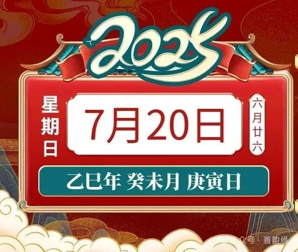 2025年7月20日,星期日,农历六月廿六 (乙巳年癸未月庚寅日),法定节假日。
