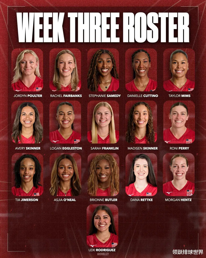 52岁的主教练埃里克·沙利文本站还征召了四位“新人”加入,包括了斯蒂芬妮·萨梅迪,自2020年起就是泛美杯常客,为美国赢得五枚奖牌。丹妮尔·卡蒂诺,则是国家队常客之一,已参加过三届VNL。蒂娅·吉默森则是首次亮相VNL,此前在匈牙利、葡萄牙和德国联赛中多次获“最佳拦网”称号。泰勒·米姆斯,曾助美国在2023年泛美杯及总决赛分别摘得金牌和铜牌。