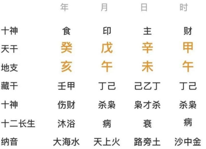 乾造:癸亥年,戊午月,辛未日,甲午时(戌亥空)