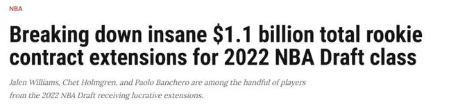 杰伦-威廉姆斯、霍姆格伦和班凯罗等2022届NBA新秀,均收获了丰厚的续约合同。对于NBA球队和新秀合同进入最后一年的球员而言,新赛季开始前的续约谈判向来是一场与时间的赛跑。今年也不例外,多位2022届首轮知名新秀与各自球队展开了多轮谈判,试图敲定一份长期合同。