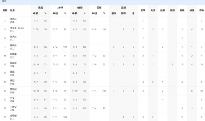 江苏队方面,罗欣棫28分8篮板3助攻2抢断,许晨妍26分9篮板1助攻,张曼曼13分2篮板7助攻。