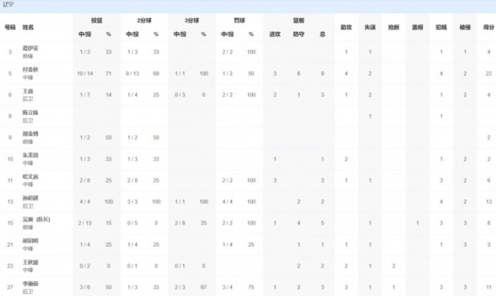 辽宁队方面,付金秋22分9篮板4助攻,孙超越13分2篮板,李雨萌11分3篮板3助攻。