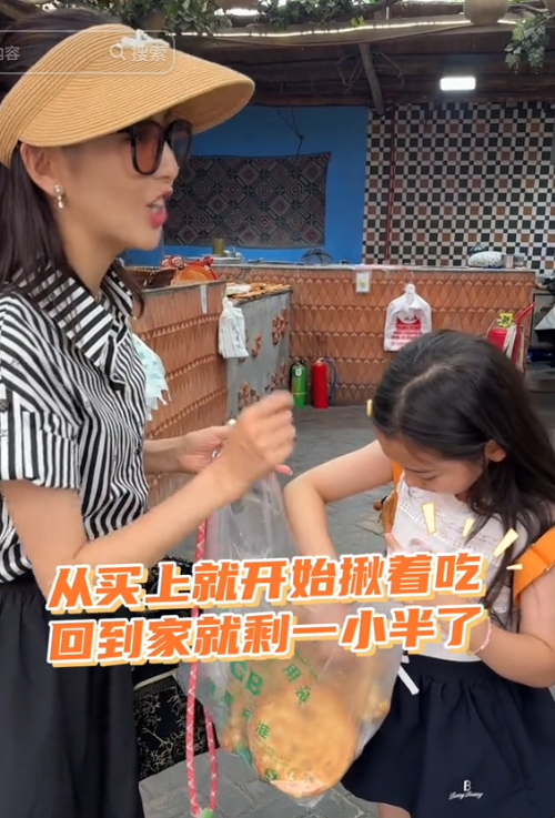 好不容易买好了“馕”,娃还没炫嘴里,佟丽娅就开始了一顿“吐槽”: