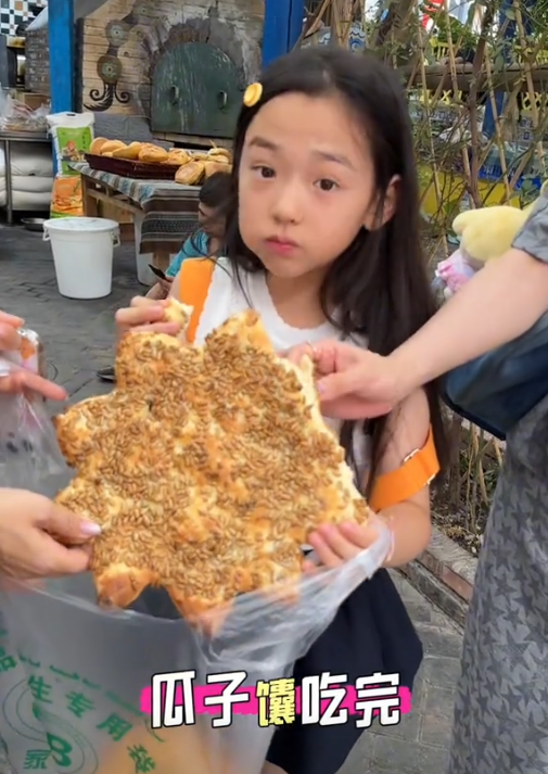 女儿更是应景,把一个“大馕”背在了身上。