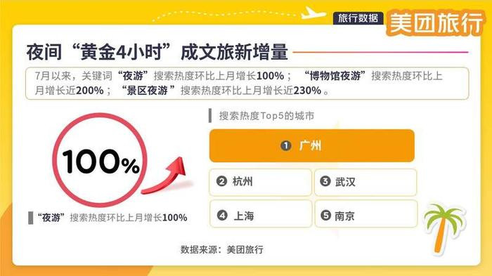 中国青年报客户端讯(中青报·中青网张均斌)随着高温天气持续,“夜经济”也正在“升温”。美团旅行数据显示,7月以来,“夜游”相关搜索量和评论量环比上月均增长100%左右,且每逢周末就会迎来搜索小高峰,搜索热度Top10的城市分别是广州、杭州、武汉、上海、南京、北京、苏州、宜昌、成都、长沙,“珠江夜游”“钱塘江夜游”“长江夜游”“黄浦江夜游”等活动均为搜索热词。