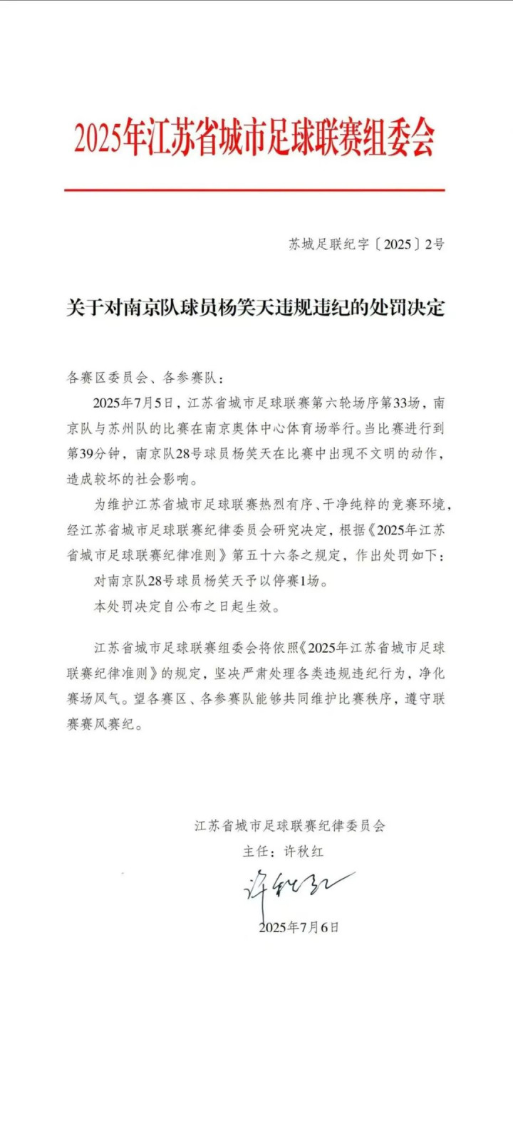 江苏省城市足球联赛纪律委员会: 对南京队球员杨笑天予以停赛1场处罚
