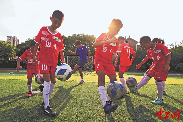 7月29日下午,南京队队员白洋(左三)来到迈皋桥小学带领孩子们训练。7月20日晚,“苏超”第七轮南京客战扬州,白洋在伤停补时阶段进球,帮助南京队将比分锁定5比1,大胜扬州队。