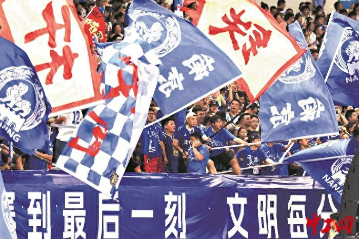 7月5日,“苏超”第六轮南京对阵苏州,南京球迷挥旗呐喊。