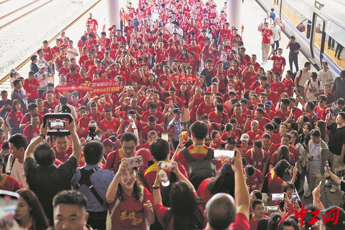 8月2日,苏州球迷乘坐“苏超专列”抵达淮安,高铁淮安东站迎来一片“红色海洋”。