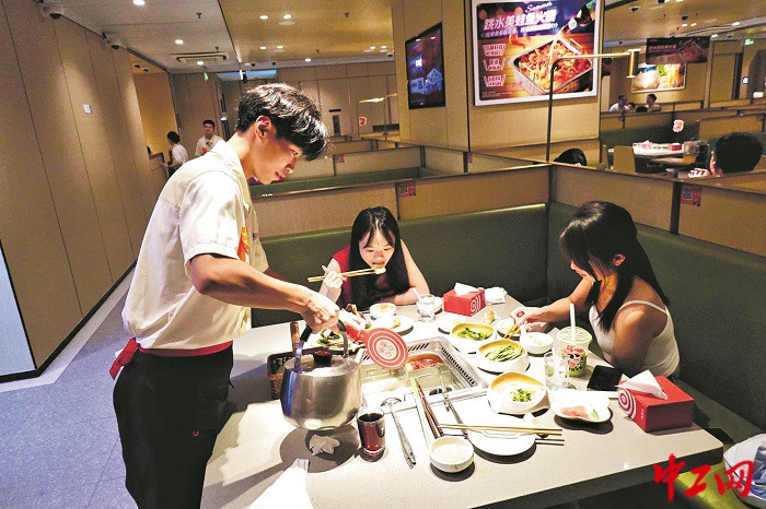 8月6日晚,盐城队队员单伟在盐城市宝龙广场海底捞火锅店工作。