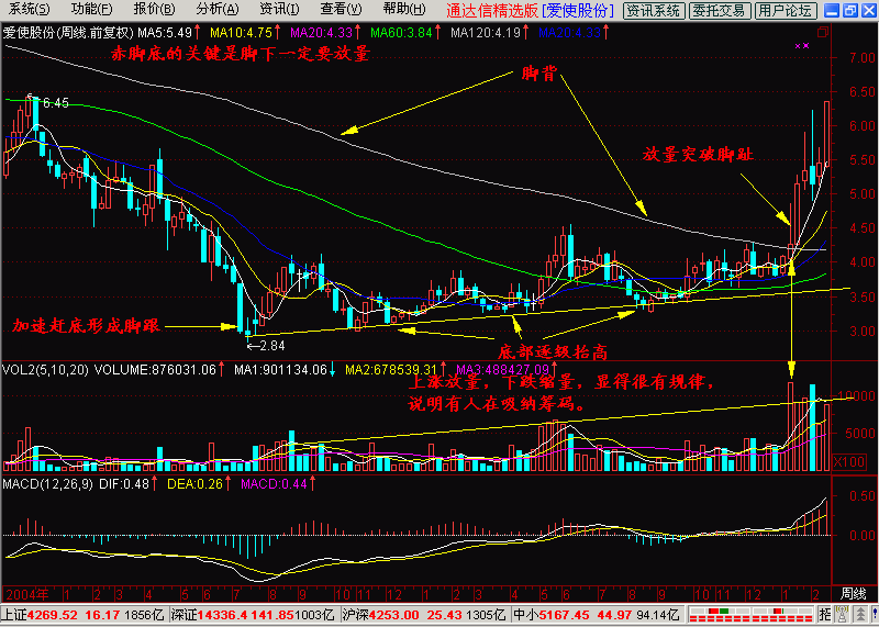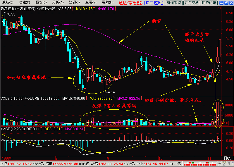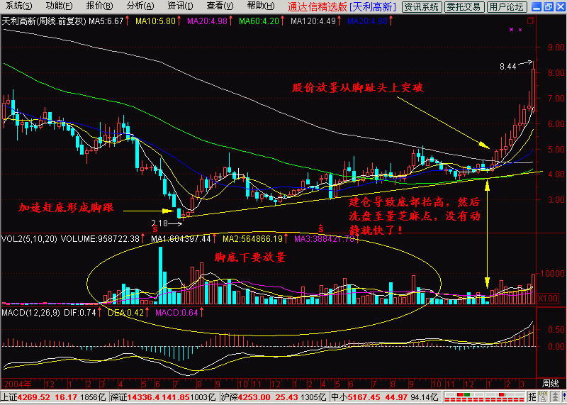 如果曾有庄家在足部区间建仓的话,此时往往会放量突破各种均线(从脚趾上飚起)而走出一段上扬行情。