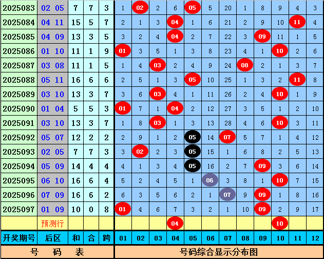 后区分析:上期该位开出奖号01和09,和值为10,跨度为8,后区前4次开出和值10和跨度8时,其下期奖号分别为:03+04、07+09、05+12、01+11,号码奇偶比为6:2,大小比为4:4,012路比为3:3:2,本期后区号码参考01、04、07、10、11,精选两码04、10。