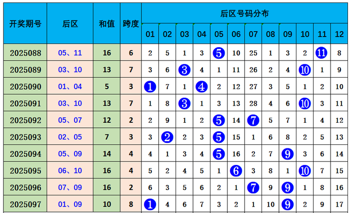 上期后区开出奖号01、09,奇偶比2:0,近10期奇偶比14:6,奇数奖号开出较热,本期推荐奇偶比1:1,参考后区号码08、11。